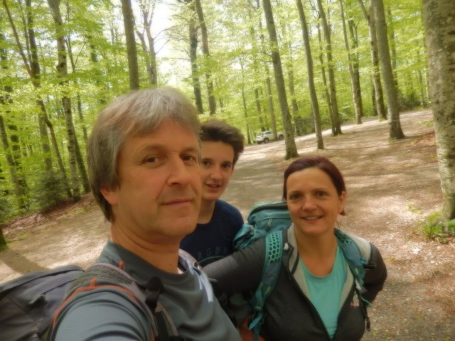 Ob dveh smo bili že na parkirišču, skoraj čisto sami. Le kje so vsi?! Mi pa vsi veseli in pripravljeni, da letimo v hrib! No, ne ravno vsi, Helena je ravno prebolevala manjšo virozo in je bila kar utrujena, a ji je šlo vseeno dobro!