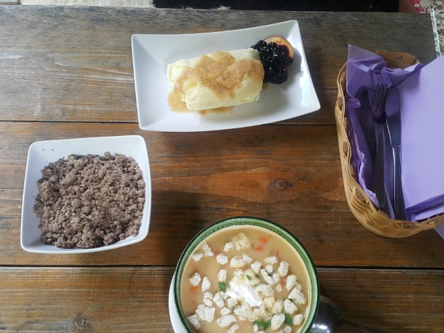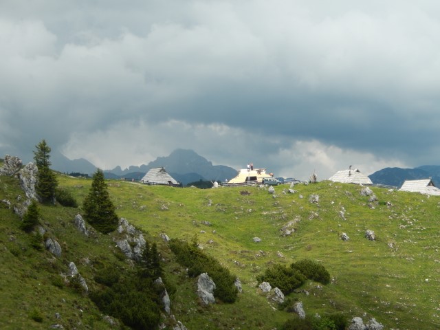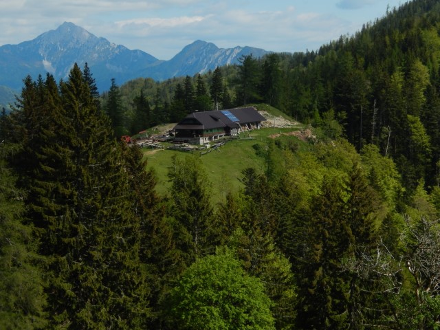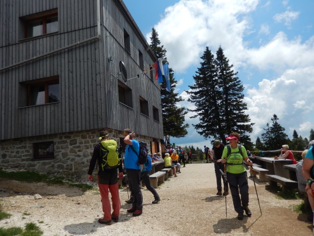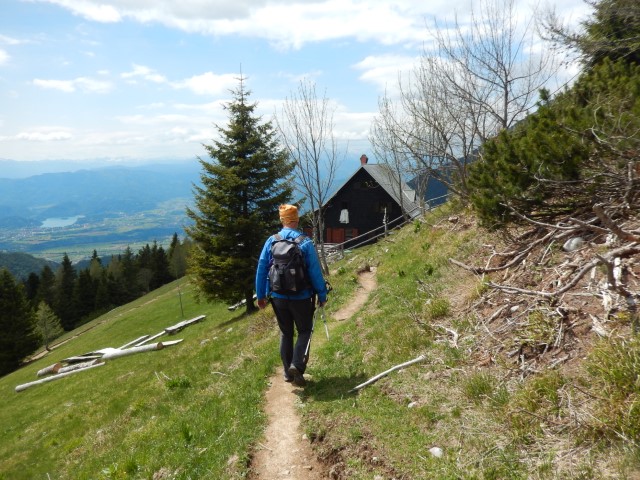 Koča na Prevali, v ozadju se repenči Storžič. Štrukljev tokrat nisva probala, jih bova naslednjič, čez neke tri mesece.