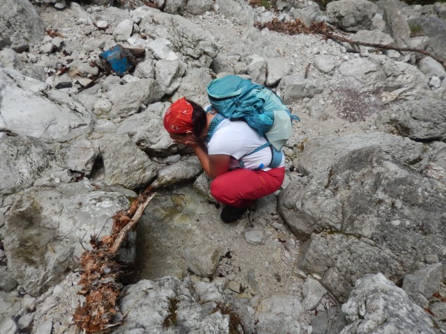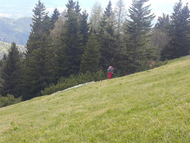Mene je spust precej skrbel, Strmina je bila precejšnja, jaz pa v tem letu še nevajen. A je Helena nekaj zaslišala, jaz pa videl neko premikanje. Pa sva fotoparat usmerila nekam tja in stisnila.
