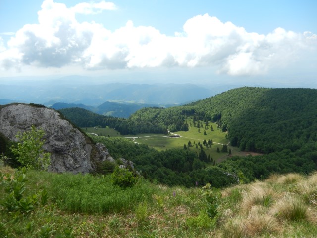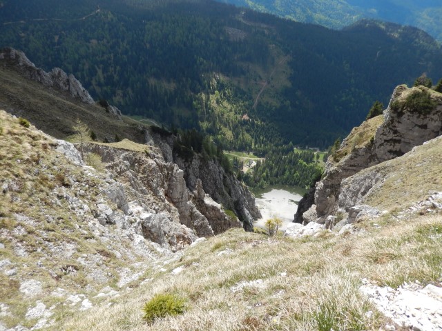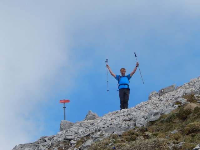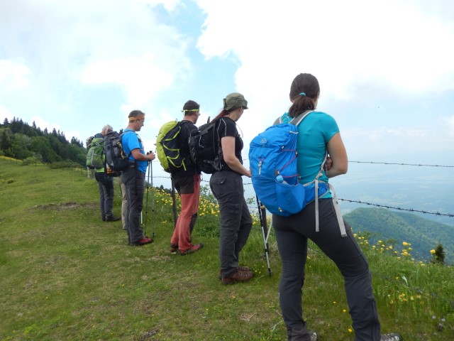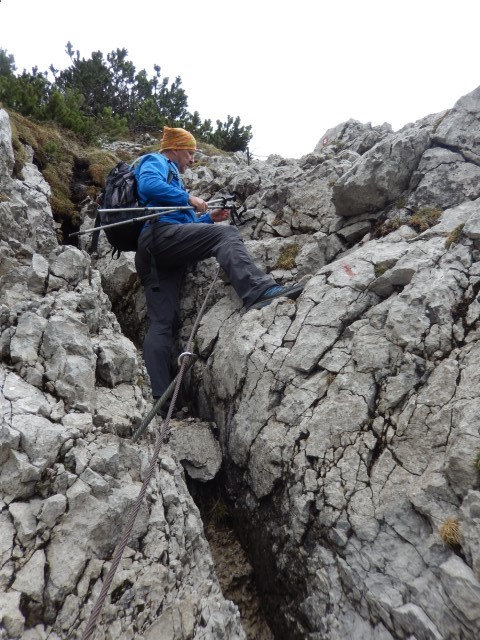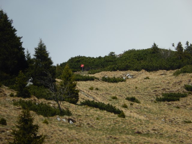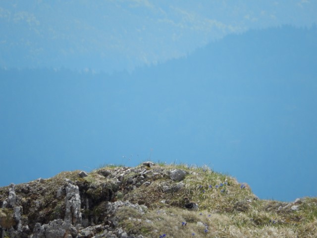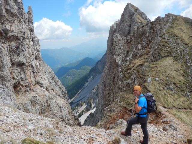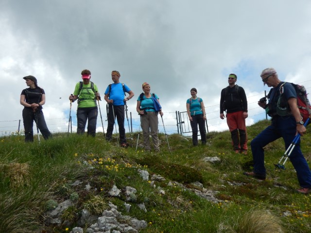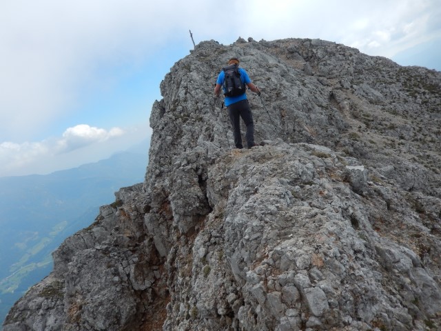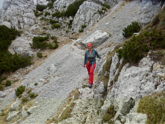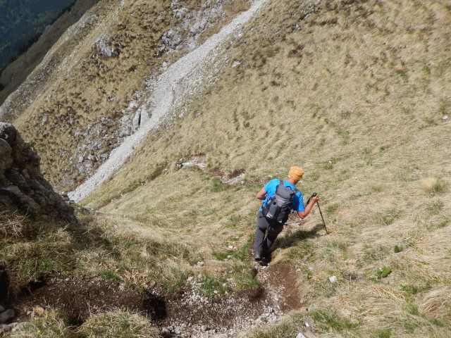 Na vrhu je malce izpostavljenosti, ni pa prav hudo, dokler ne gledaš na avstrijsko stran. Starejšemu paru pred nama je padla palica po strmini - na našo stran, ne na avstrijsko k sreči - pa se jo je možakar kar pogumno, mogoče celo preveč pogumno, spravil reševat. Tokrat mu je uspelo.