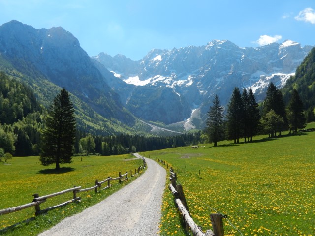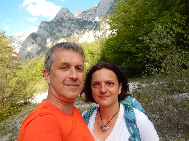 Naprimer konec maja 2017 je bil en tak prav dober dan, ravno pravi za pregled poti, koče že odprte, snega ne več. Pa še zgodaj ni treba vstat, začela nisva pred enajsto! Opa!
