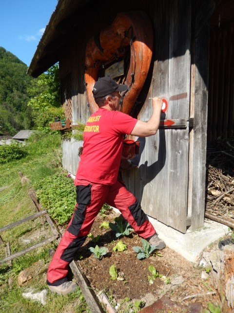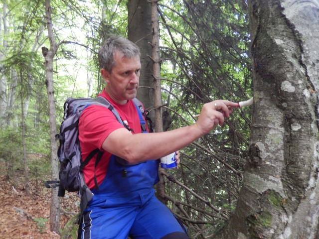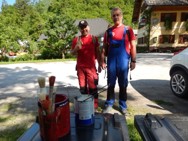 Pri Jurčku, ta prava markacista! Vse barve in čopiče je tokrat še Lojze pripravil.