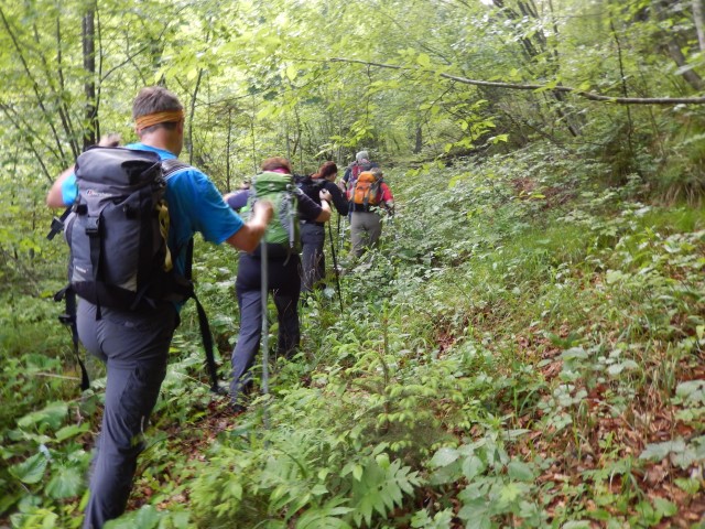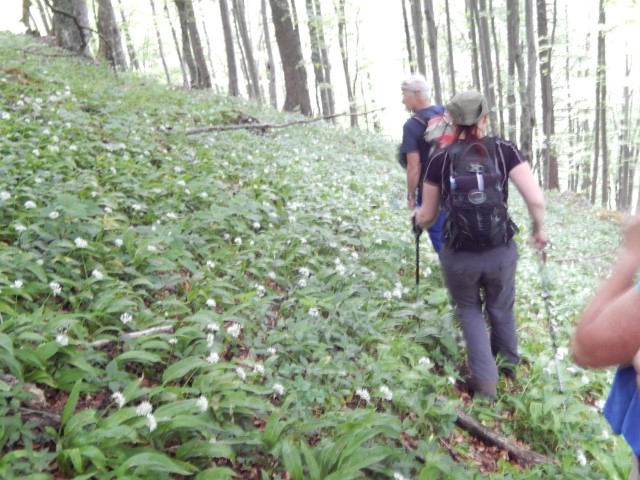 Nič japajade, kar direkt dol smo šli. Skozi nasade čemaža se je pot izgubljala in nismo prav dobro vedeli ali Bojč to kar na pamet lepo vijuga ali celo res vidi kako potko.