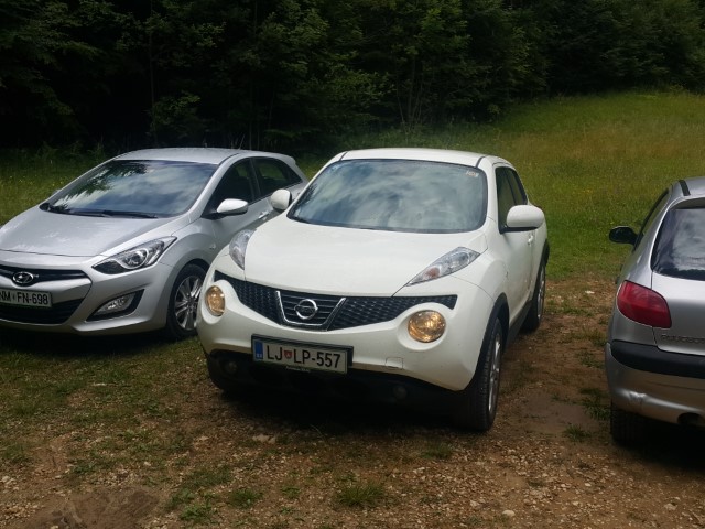 Potem sem pa v tistem čisto zadnjem klančku, tik pred izravnavo, nekaj se zamislil, šel (pre)počasi in Juke se je direkt tam ustavil. Ah? Sprednja kolesa na vrhu klančka, zadnja pod njim. In kaj zdaj? Nisem niti probal speljat, ne bi imelo prav nobenega smisla, Juke je lahek in močan avto, kolesa se obrnejo vse prelahko.
