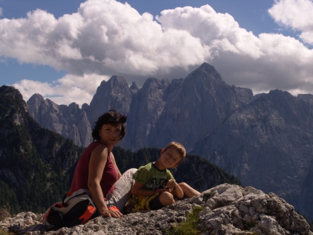 Ampak to še ni vse. Je treba še dol prit. In če že sva toliko pogumna, pa bodiva pogumna še naprej in pejva še naprej po Aniti Goitan. Ker se nekdo ni najbolje pripravil in ni najbolje vedel, kaj to sploh pomeni. Nervoza se je delala, da je minila, na vrhu sva bila, saj hujše pa res ne more bit več, no! Pa sva šla proti Mojzesovi škrbini.