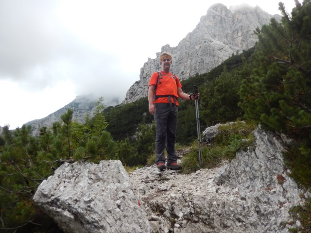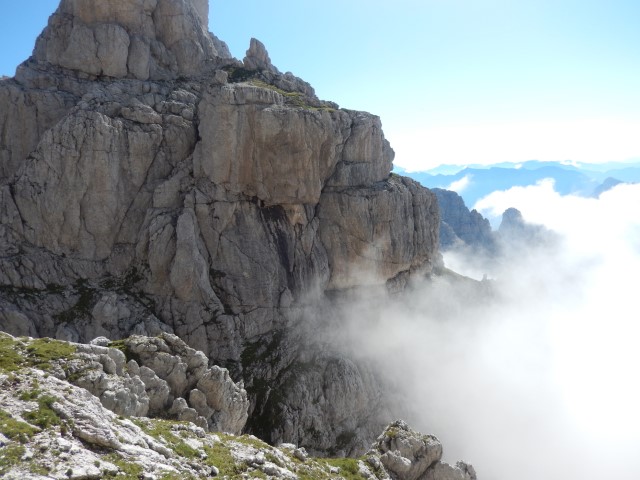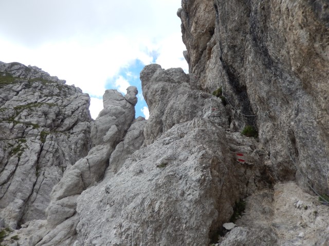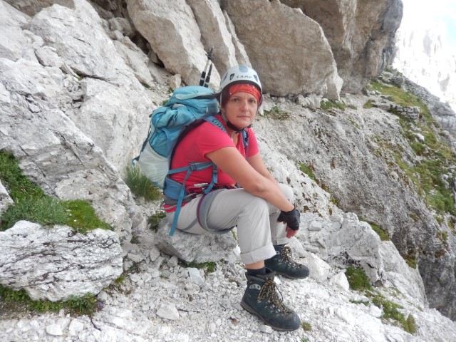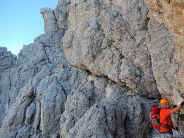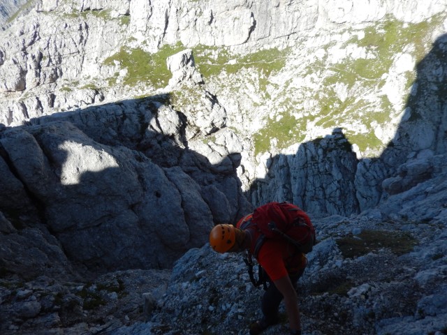 Okolica je bila fascinantna, sredi stene si, res veličastno, pot niti ni tako grozna, sem in tja ti sicer kak del telesa visi v globino, a, hej, bo že nekako! Pa vseeno ti počasi kljuva zadaj v glavi, počasi sva oba vedno bolj nervozna.
