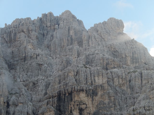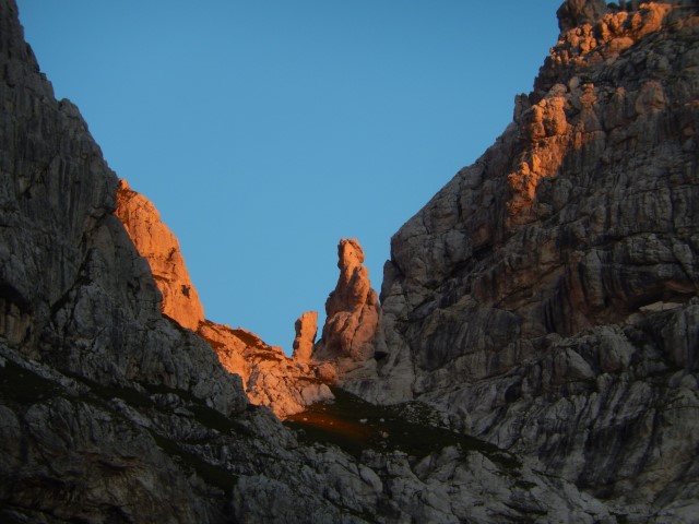 V kaminih pa potem spet italijanske ohlapne, tanke zajle, ki so bile povrh vsega še vse vlažne in so kar fino drsele. Klin, dva, več pa pomagal ni bilo, zato sem sam skozi tisti kamin skoraj drsel, si pobral vse komolce in delal dvometrske razkorake, tja do brade. V takih primerih se mi vedno začne muditi in namesto, da bi počasi iskal dobre stope in oprimke, se začnem vedno bolj oklepat zajle in z nogami delati vedno večje razokrake. Kar pa je težko, če je pod tabo le globina...