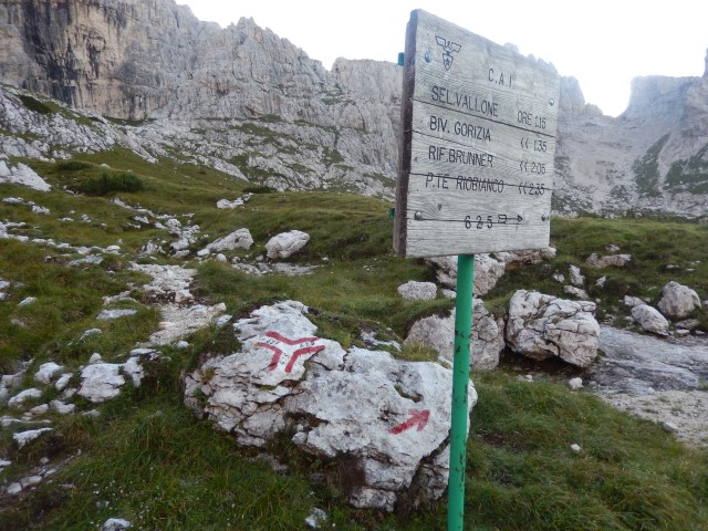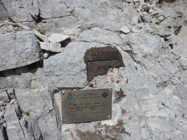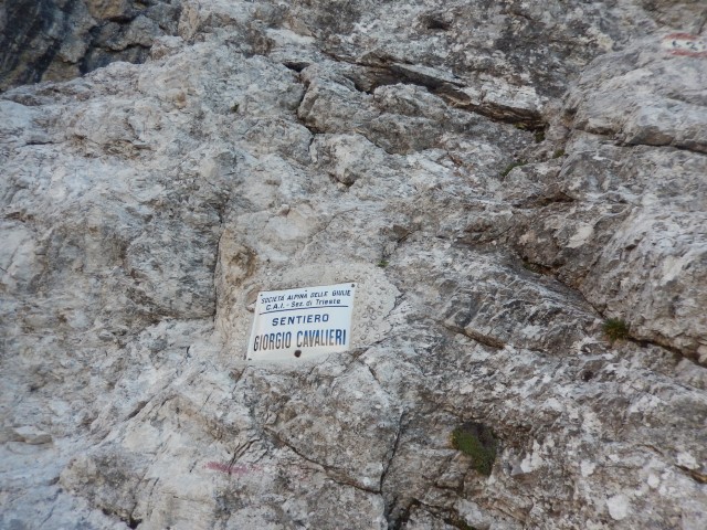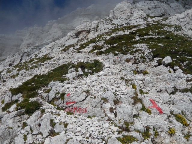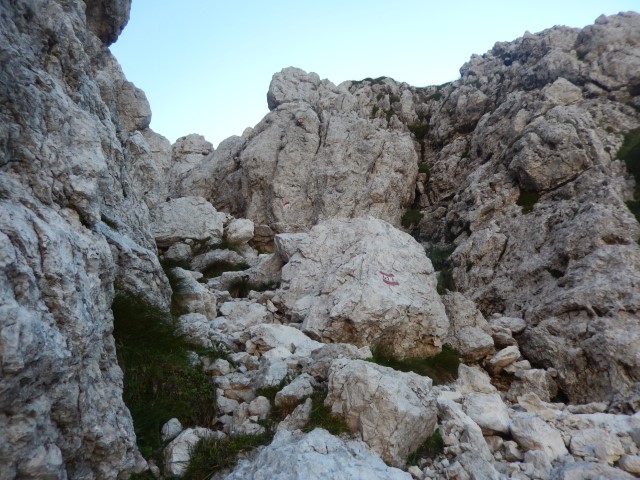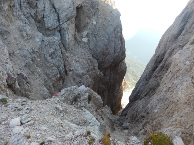 Tole je Forcella di Riofreddo, Trbiška škrbinica, grozen žleb, skozi katerega je bil včasih prehod v dolino Mrzle vode, zdaj pa so ga le prestavili bolj vzhodno. Tule je vse podrto, povsod pa so narisani veliki rdeči "NO", še tistih nekaj redkih jeklenic je seveda potrganih. Ampak nekateri še vedno rinejo tu gor, večkrat pozimi, čeprav prav nič ne verjamem, da je tule pozimi kaj bolj prijetno.