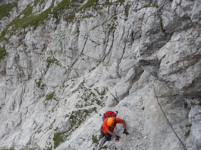 Če pogledam nazaj, je pravzaprav že ta ta prvi vstop precej zoprna zadeva, vendar ga skoraj ne opaziš, ker si šele povsem na začetku. Po tisti prečni polički se je treba prebit malo višje brez kakšnega varovala. No, nič hujšega, a zdaj, ko pogledam nazaj, je bilo že tisto kar precej za naju.
