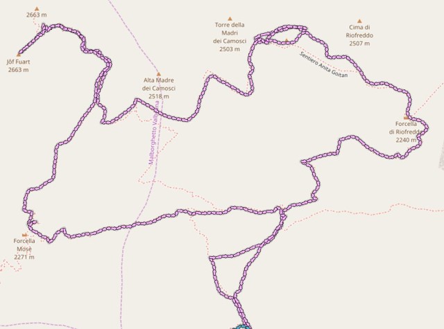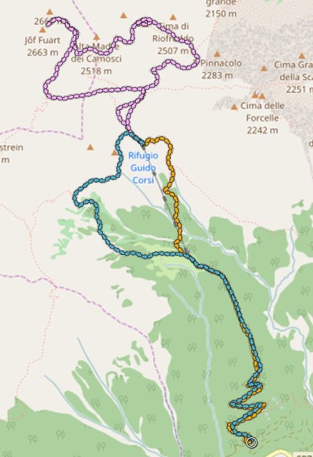 Takole pa od koče Corsi. Se lepo vidi na začetku malo izgubljanja, pri Innominati pa moji krogi sem in tja.