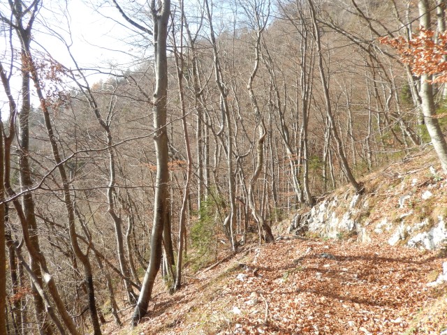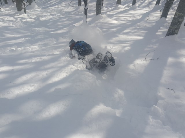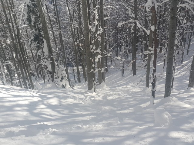 A pot dol naju je še čakala in ker je bil sneg... in ker je bilo veliko snega... sva kar tam pod Gojško planino zagazila direktno navzdol v globok sneg. O, kaka uživancija!