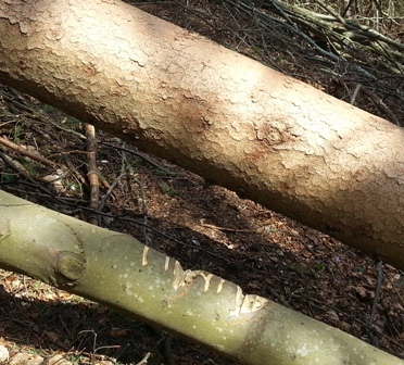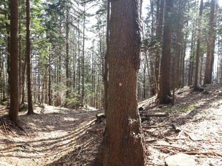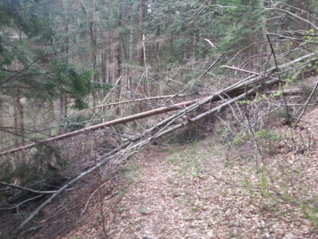V zgornjem delu poti se potem najde še kar nekaj podrtih smrek, tole ni bil več žled, prej kakšen snego ali vetrolom.