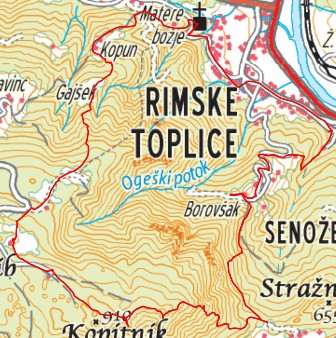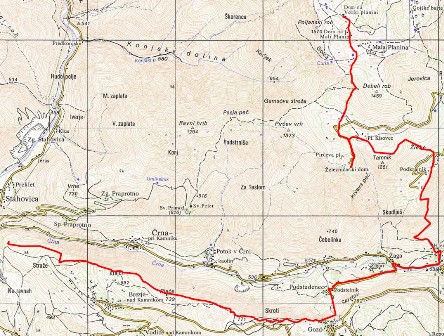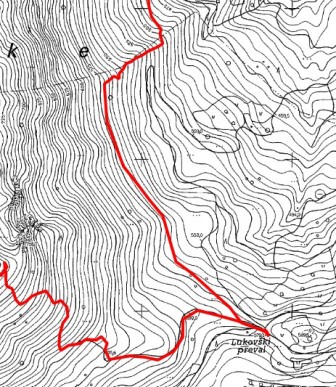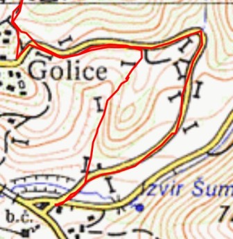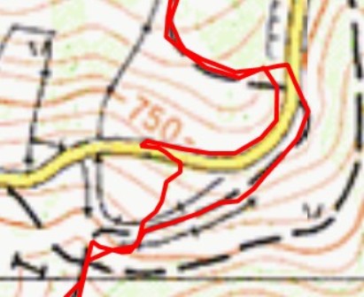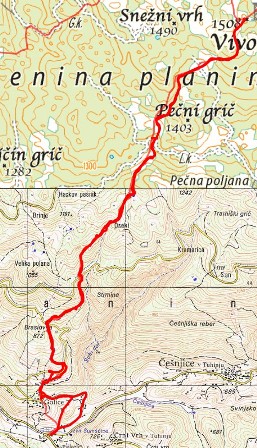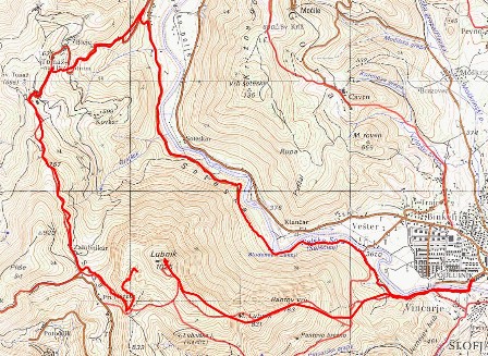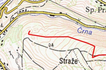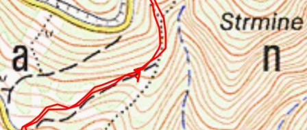 Začela sva kar po cesti. Kot je zdaj na novo markirano, čeprav je pot speljana nekje drugje, a ni označena in se je ne vidi več. Tista rdeča črta počez pa je najina pot navzdol. Seveda sva jo ubrala čez travnik, ne bova še enkrat rintala po cesti...
