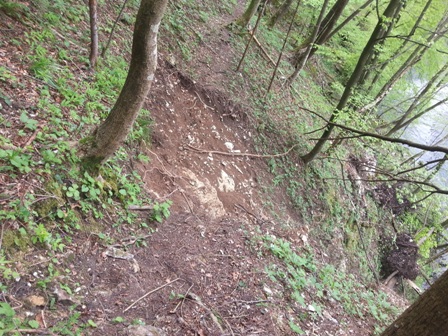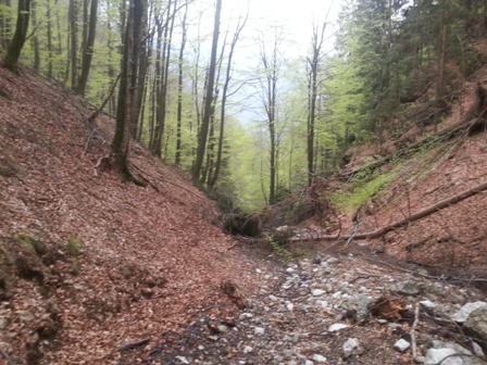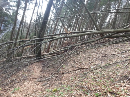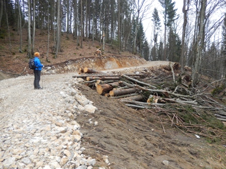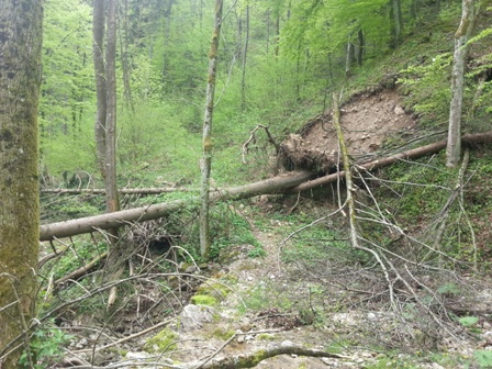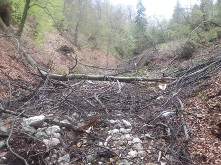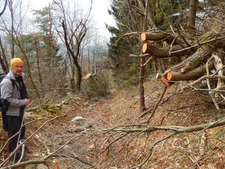 Navzdol grede pa le vidiva, da je tisto, kar je navzgor zgledalo neprehodno, pravzaprav prehodno, nekdo je debele veje kar lepo požagal.