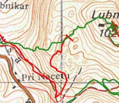 Najprej je padla ta o velikem stezosledcu. Takoj. Tako na samem začetku. Zelena je pot po kateri bi moral iti dol (po tej smo šli na trekingu gor) in je čisto super uhojena pot, sicer ni markirana, je pa dovolj vidna. Ampak za stezosledca zgleda ne dovolj. Najprej sem seveda pozabil vključiti gps, a sem ga vključil ravno v trenutku, ko sem potem vse skupaj tudi zgrešil. Pot v desno, jaz v levo. In še bolj v levo in v levo in v levo... Eh., stezosledec.