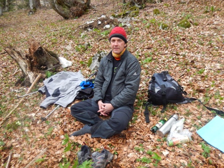 Zaradi megle sva potem kar hitro obrnila, do koče se meni tokrat ni dalo, ker sem bil moker, sva pa potem raje malicala malo nižje, ven iz megle. Kjer je tisti, ki se je nespametno obul, sušil svoje štumfke...
