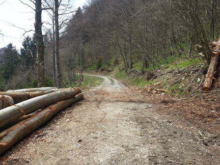Največ podrtega je ravno v začetku, ko se prebijaš med pašniki. Mislila sva, da je kolovoz neprehoden, zato sva jo zavila kar direktno gor na cesto in se potem prebijala čez ograje. Zoprno. Dol grede je bilo potem mnogo bolje.