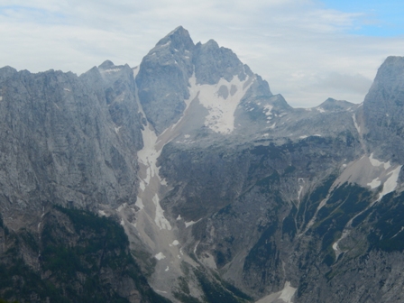 Na strehi se prikaže prvi sneg, a ga sploh ni veliko in se mu da izognit. Nato vidim v daljavi trop živali (niti ne vidim ali so kozorogi ali gamsi) pa se mi skrije za greben še preden mi uspe fotografirat. Škoda, pa tako zgoden sem in še prvi! Sonce pa že visoko na nebu in žge. Žge. Tudi na tej višini!