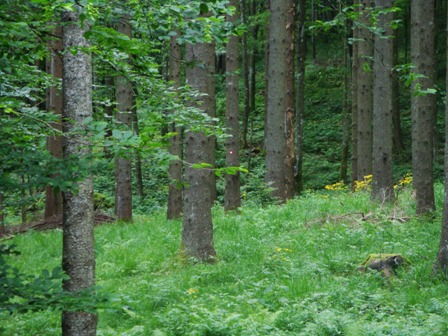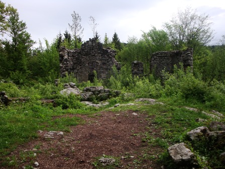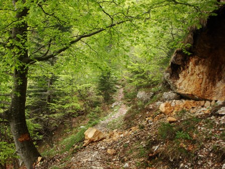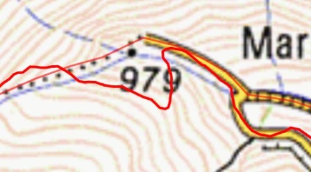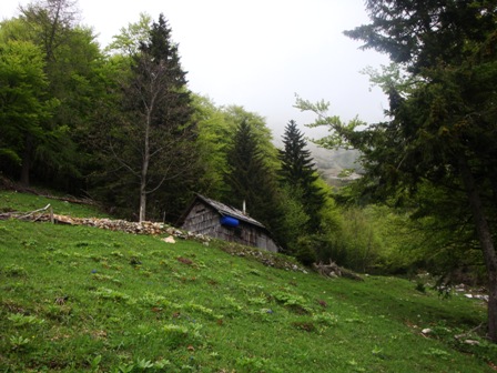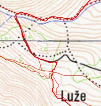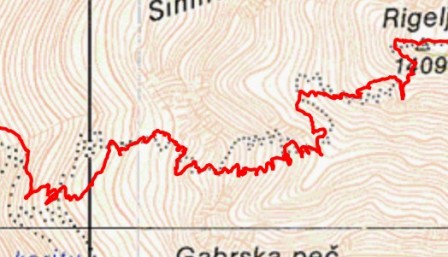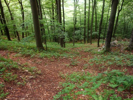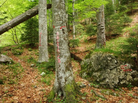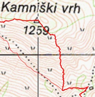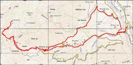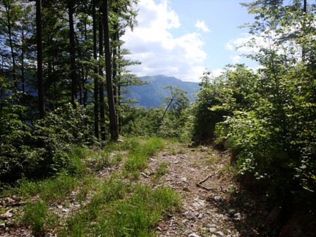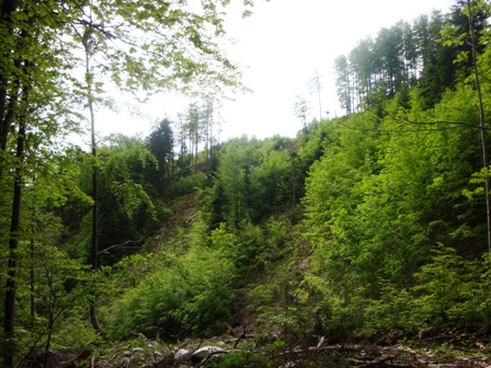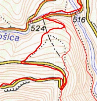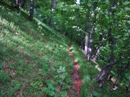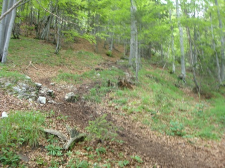 in spregledam potko, ki pride z leve. Ker ne gledam karte, temveč hodim po spominu, se mi čez par metrov utrne, da bi moral tule nekje dol, da skrajšam vsaj zadnje metre ceste. Ob prvem kolovozu jo udrihnem dol in srčno upam, da mi ne bo treba kam nazaj...