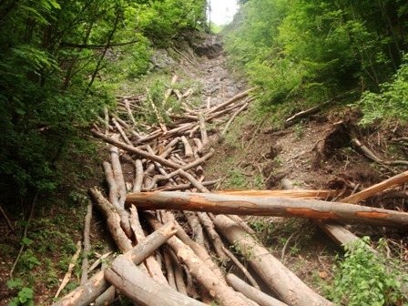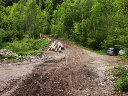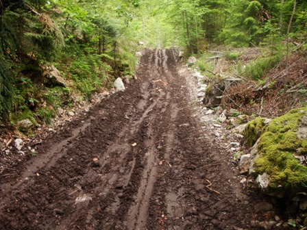 Tukajle greš lahko desno ali levo, levo je malce dlje, a če pojejo (SPET!) žage na desni, greš sigurno na levo... Potem si na istem, kot sem bil zadnjič, v koncu Korošice, od koder je le par minut do Markove ravni. Tam je sicer vse malo zmešano, ker kar naprej nastajajo novi in novi kolovozi in vlake. Takole gre blatna vlaka v letu 2013: