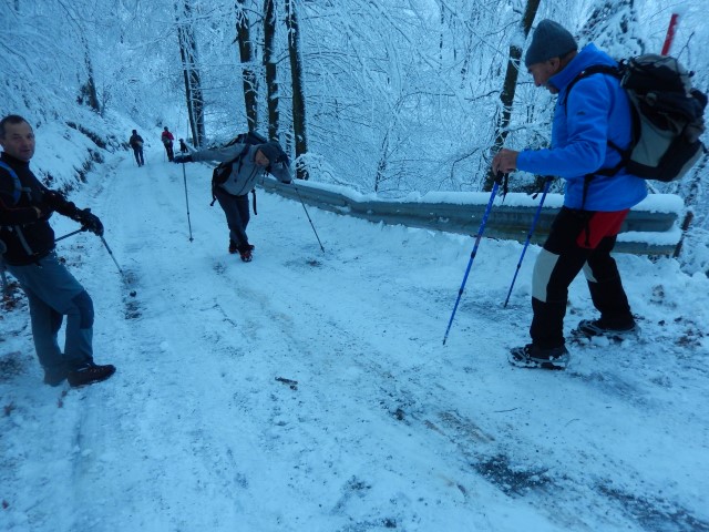 Nekaj časa je šlo, tule na drseči cesti pa smo le obupali in nataknili dereze, pa še to šele po tem, ko je vsak vsaj trikrat zgrmel.
