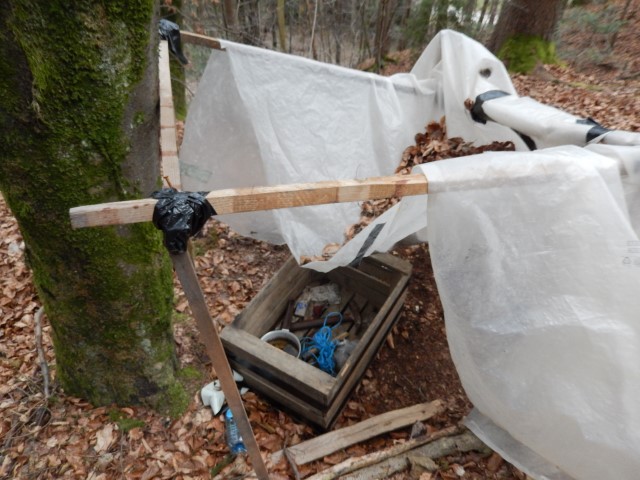 Kako pa zadet začetek, če ne veš, kje je? Eh, kar nekje sredi hriba, naproti cerkvice v Rovi, sva jo mahnila direkt navzgor. In, hecno, takoj sva naletela na neko malce zapuščeno bivališče! Ampak nekdo je tukaj nekoč bival, vsaj kak dan, dva... Kako sva midva to zadela in to direkt pa nama seveda ni bilo čisto nič jasno.