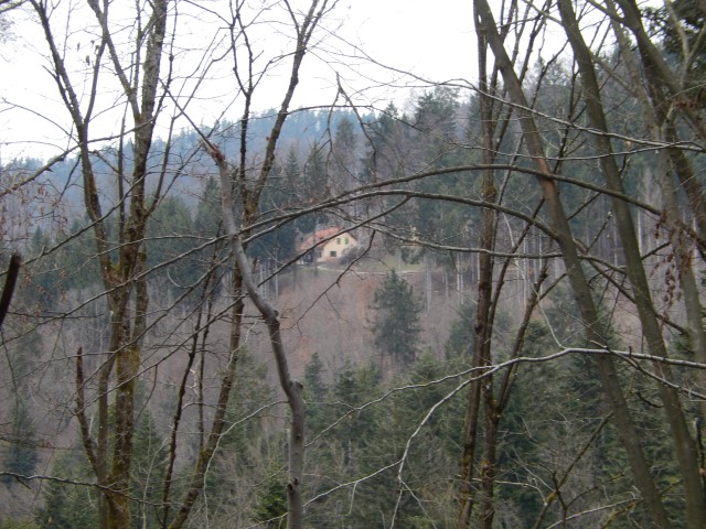 Da sva lahko potem šla po drugem grebenčku nazaj proti Rovi. Nekaj poti, nekaj brezpotij, a nikjer se ne moreš prav zgubit, vedno se kaj vidi - tokrat je bil to Lovski dom, ki pa se ga od spomladi naprej ne vidi več, le pozimi.